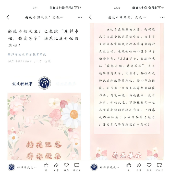 活动现场,百合、玫瑰、康乃馨、向日葵等花卉错落陈列,侧柏叶、满天星点缀其间,交织出一片春意盎然、生机勃勃的景象。女教师们凭借丰富的想象力与灵巧的双手,精心修剪枝叶,依据花卉的色彩、形状进行有层次的搭配,创作出一篮篮形态各异、娇艳动人的插花作品。完成创作后,大家纷纷拍照留念,借美丽花束传递美好祝福。比赛结束后,文教院微信公众号于3月6日至3月8日发布投票推文,根据投票结果评选出优秀作品若干。